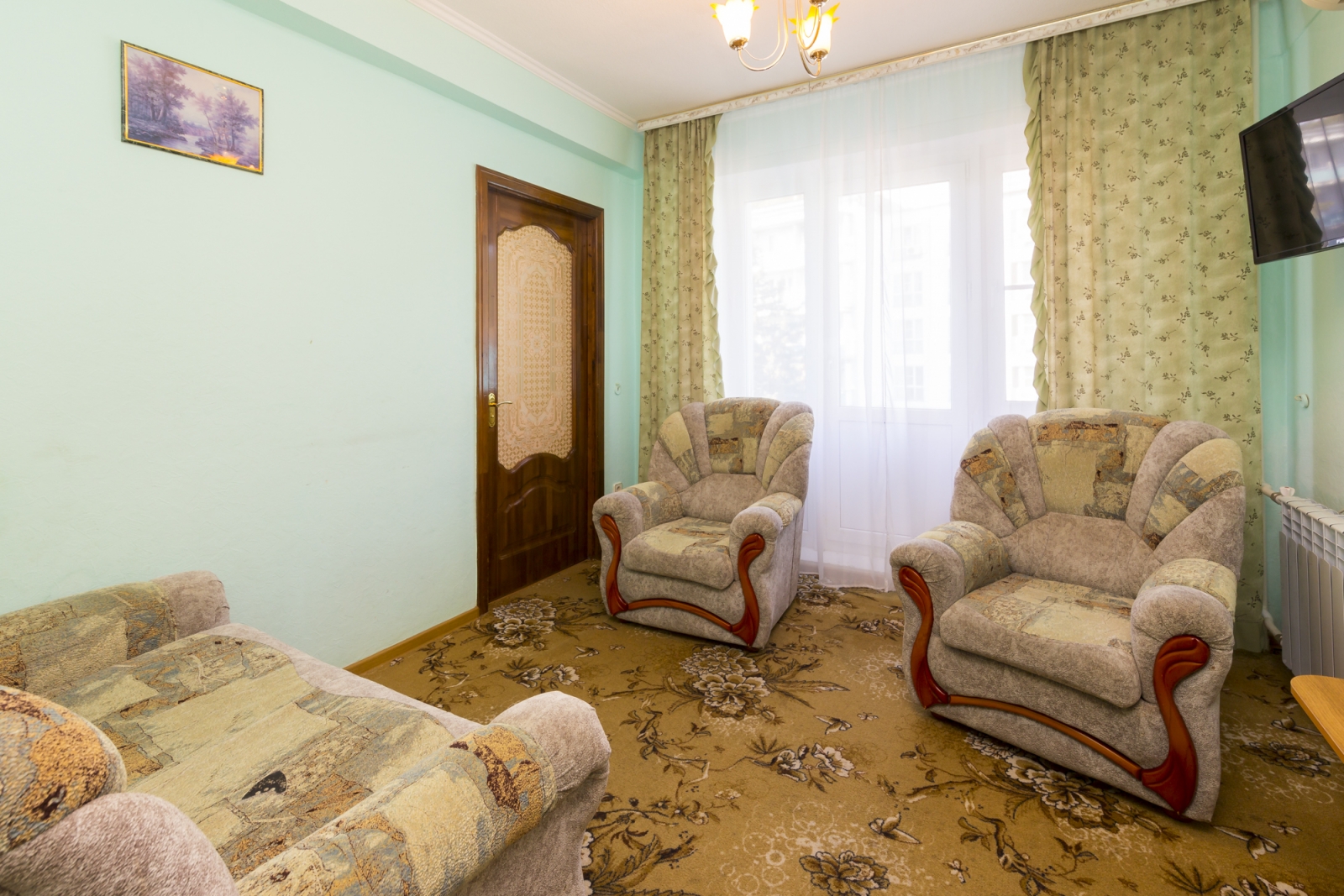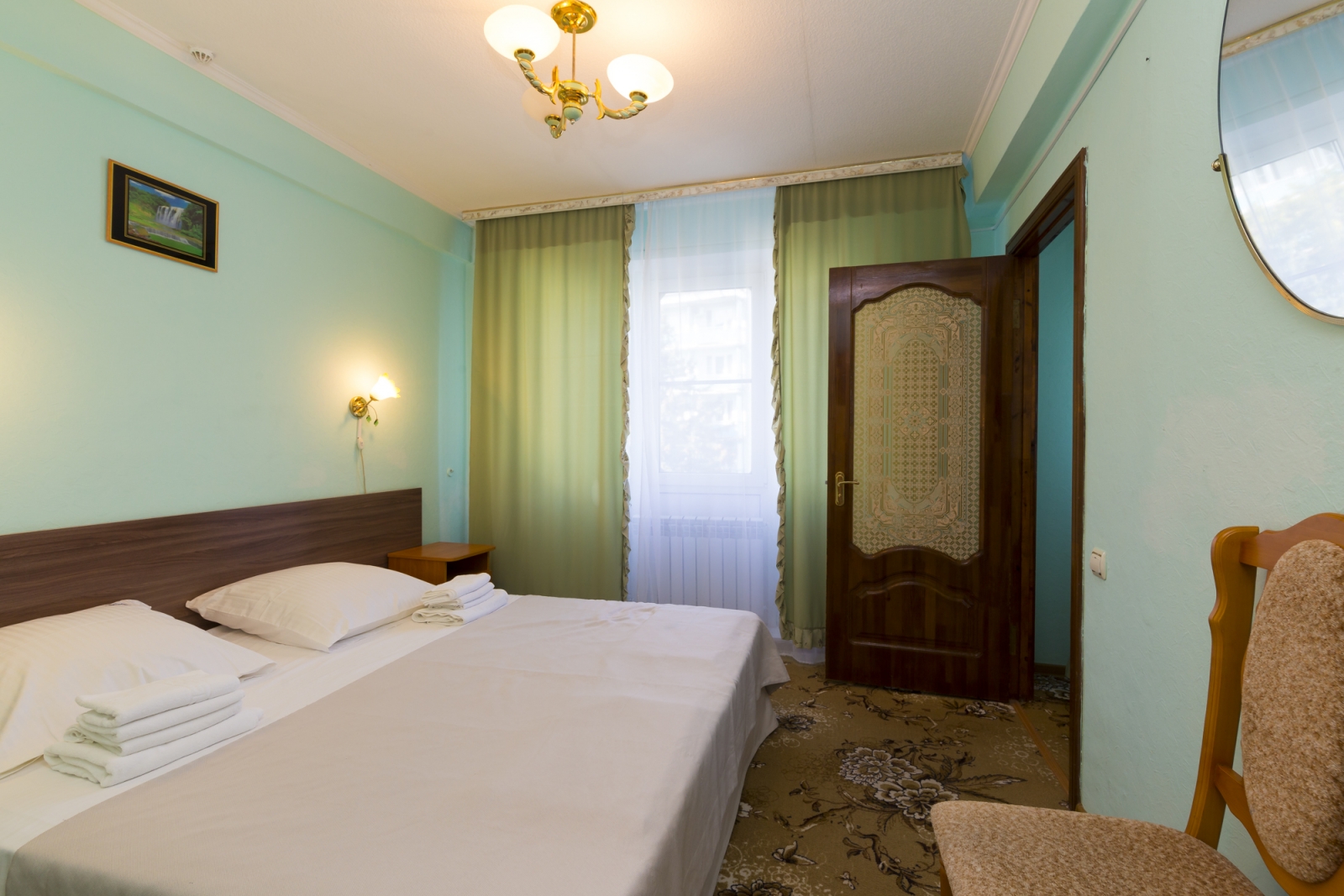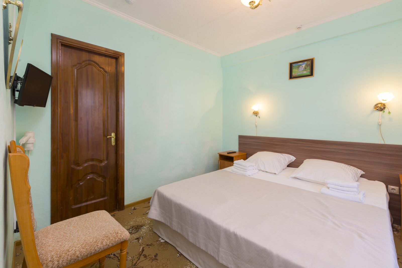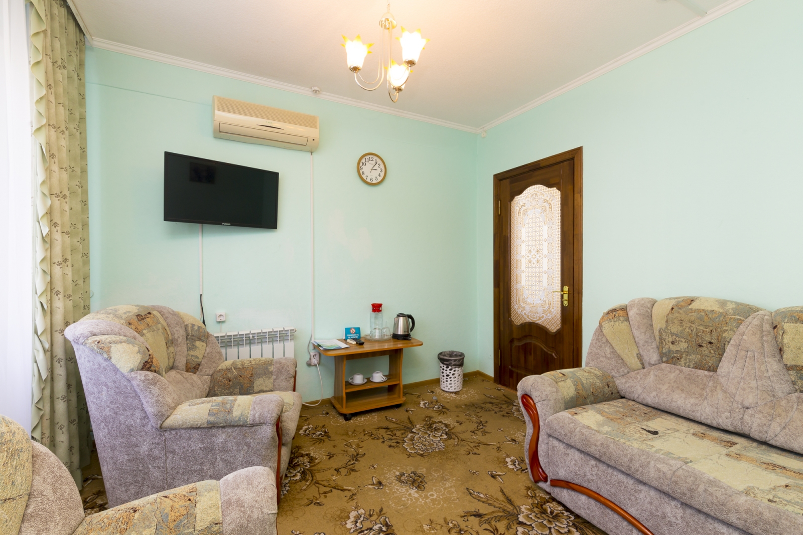 Площадь номера - 34 кв.м. 2 осн. места. 2 доп. места. Мебель: диван, зеркало, кресла, кровать двуспальная, прикроватные тумбочки, столик журнальный, стулья, шкаф. Оборудование: кондиционер, телевизор, холодильник, электрочайник. Санузел: с ванной, туалетные принадлежности, фен. Сервис: смена полотенец (1 раз в 5 дней), смена постельного белья (1 раз в 5 дней), уборка номера (ежедневно).