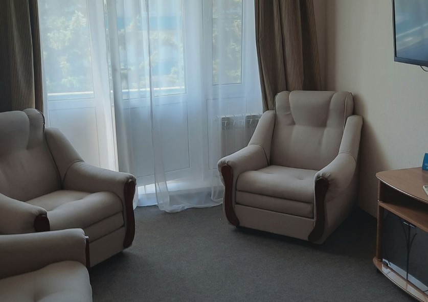 Площадь номера - 36 кв.м. 1 осн. место. 2 доп. места. Мебель: вешалка, диван, зеркало, кресла, кровать двуспальная, прикроватные тумбочки, столик журнальный, стул, шкаф. Оборудование: кондиционер, телевизор, холодильник, чайный набор посуды, электрочайник. Санузел: с душем, фен. Сервис: Wi-Fi бесплатно, смена полотенец, смена постельного белья, уборка номера.