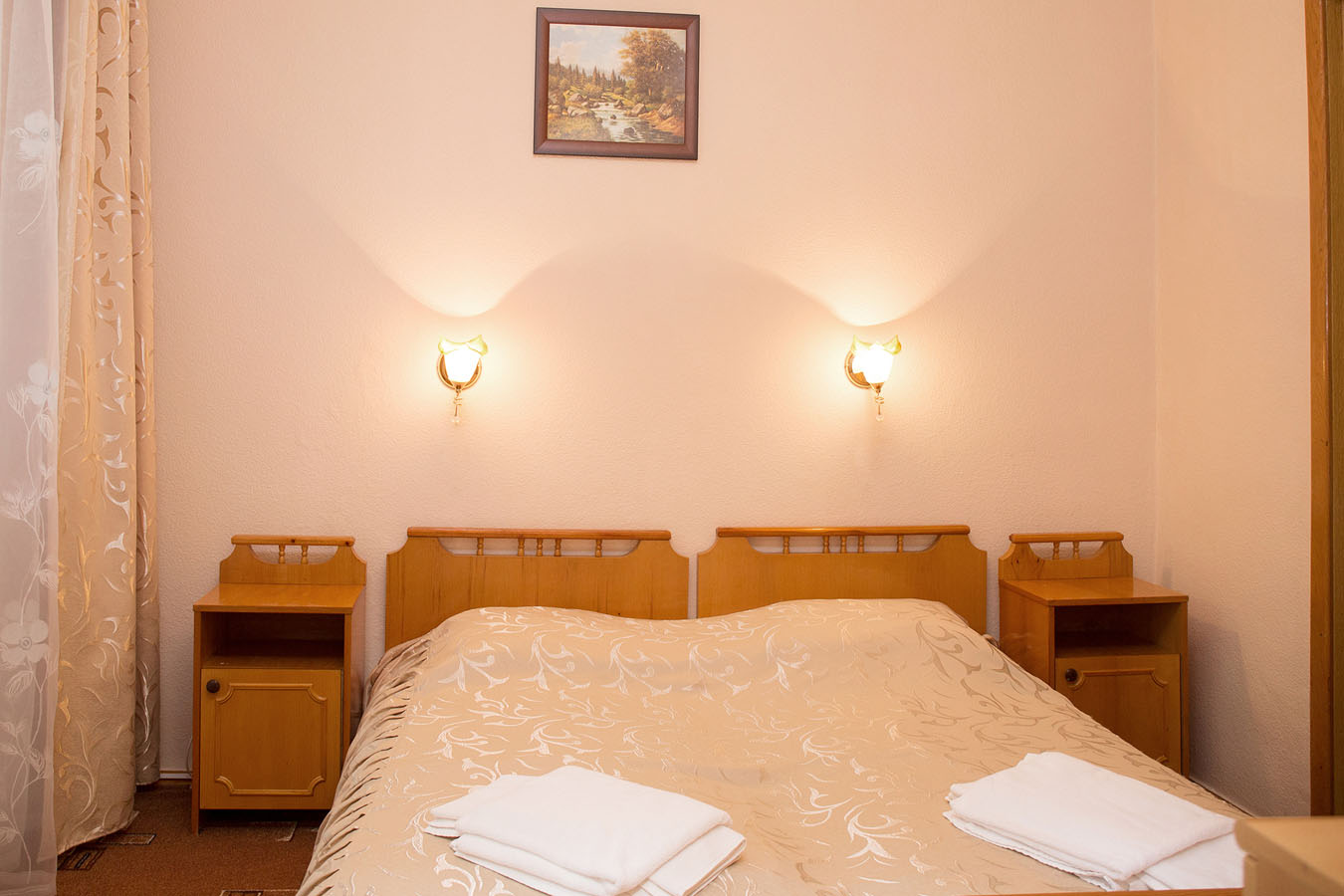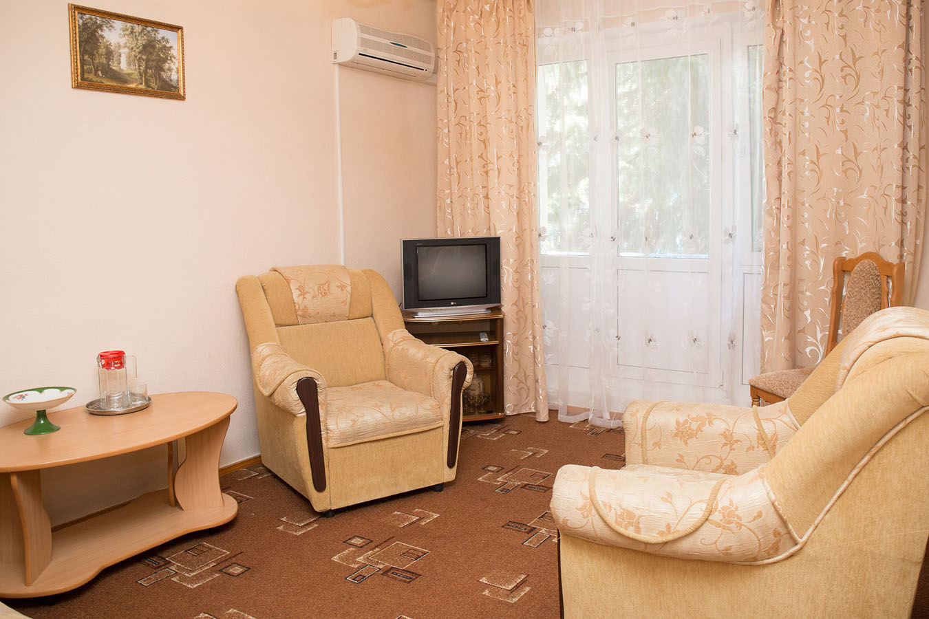 Площадь номера - 44 кв.м. 2 осн. места. 2 доп. места. Мебель: диван, зеркало, кресло, кровать двуспальная, прикроватные тумбочки, столик журнальный, стулья, шкаф. Оборудование: кондиционер, телевизор, холодильник, электрочайник. Санузел: с ванной, туалетные принадлежности, фен. Сервис: смена полотенец (1 раз в 3 дня), смена постельного белья (1 раз в 3 дня), уборка номера (ежедневно).